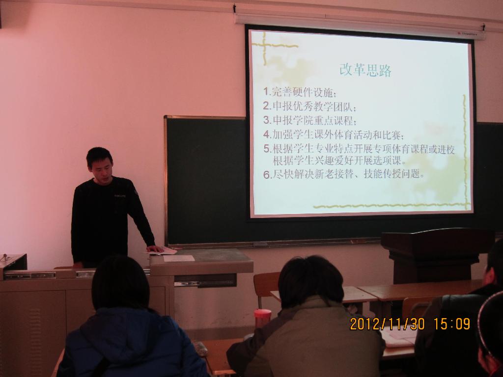 2012年11月30日下午,体育部组织全体教师在教学楼911多媒体教室开展说课比赛活动。